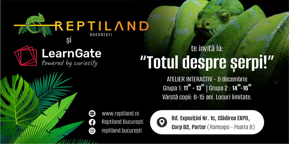 Acceptă provocarea de a te aventura în această călătorie extraordinară a cunoașterii și descoperirii. Așteptăm cu nerăbdare să te întâmpinăm la atelierul nostru, unde vei experimenta nu doar fascinația șerpilor exotici, dar și bucuria și înțelegerea aduse de această interacțiune unică. Nu rata ocazia de a participa la atelierul interactiv „Totul despre Șerpi” – o experiență captivantă oferită de Reptiland și LearnGate.
