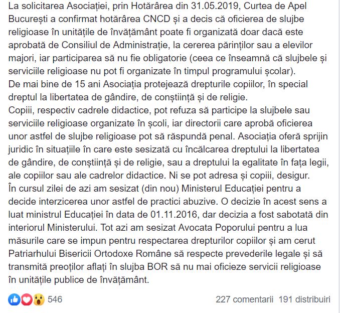 Prin postarea pe rețelele de socializare, Moise le atrage atenția elevilor, cadrelor didactice şi părinților, că slujbele şi serviciile religioase în școli sunt organizate ilegal.