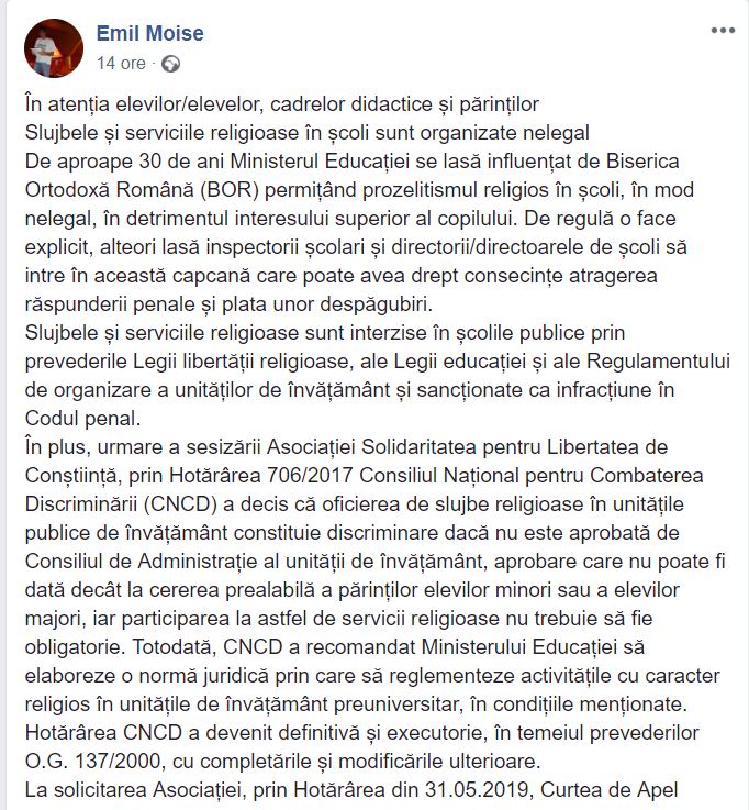 Într-o postare pe Facebook, Emil Moise, profesorul de filosofie din Buzău care s-a războit în instanță cu Ministerul Educației şi Biserica Ortodoxă, pentru a scoate icoanele din școli şi pentru ca ora de religie să devină disciplină opțională, lansează un avertisment public, înainte de începerea anului școlar. Acesta scrie că obiceiul organizării slujbelor religioase în contextul festivităților de deschidere este în afara legii.