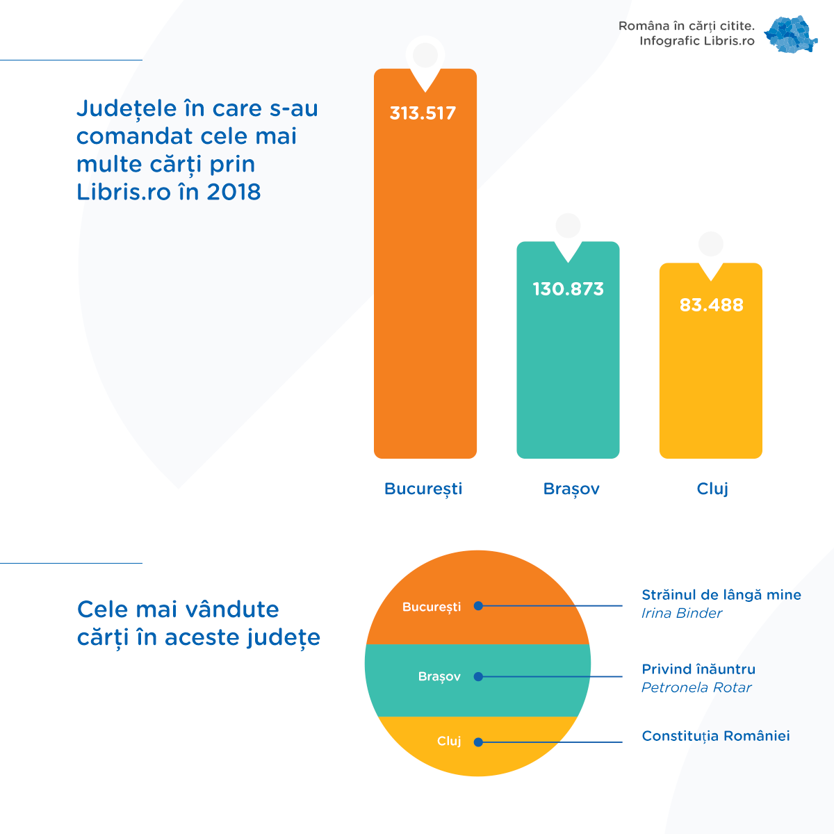 București, cu 313.517 cărți, Brașov, cu 130.873 și Cluj cu 83.488 sunt județele în care s-au comandat cele mai multe cărți prin Libris.ro în 2018. Cele mai vândute titluri în aceste județe au fost Străinul de lângă mine de Irina Binder în București, Orbi de Petronela Rotar în Brașov și Constituția României, în Cluj.