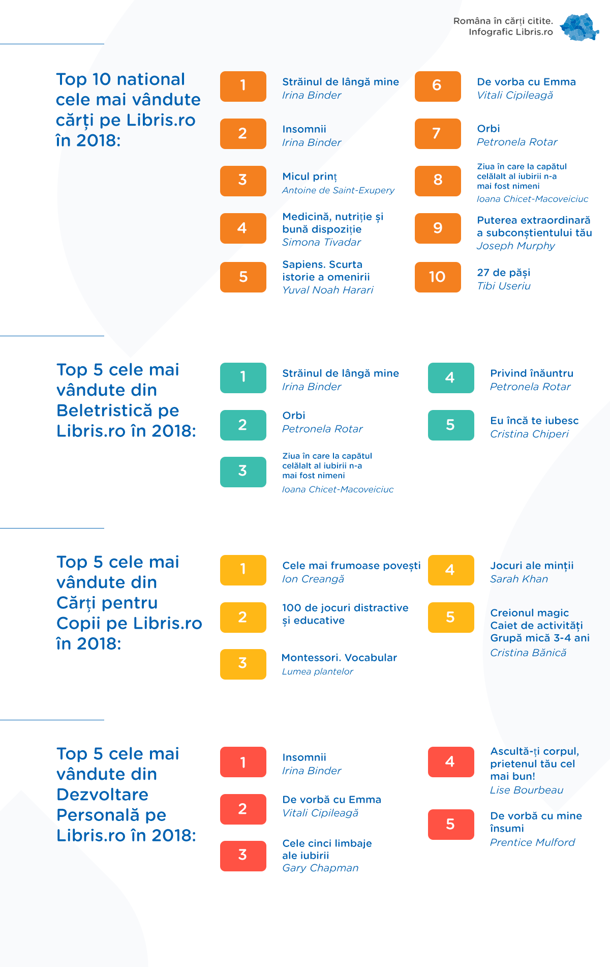 Străinul de lângă mine al româncei Irina Binder, este cea mai vândută carte pe Libris.ro în 2018, fiind cartea preferată în 30 dintre cele 42 județe ale țării. Cartea Insomnii, a aceleiași autoare, se află pe locul 2 în topul național, urmată de volumele Micul Prinț de Antoine de Saint Exubery, Medicină, nutriție și bună dispoziție de Simona Tivadar și Sapiens. Scurtă istorie a omenirii, de Yuval Noah Harari.