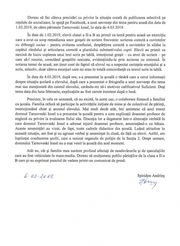 „Doresc să fac câteva precizări cu privire la situația creată de publicarea selectivă pe rețelele de socializare, în speță pe Facebook, a unei secvențe din tema pentru acasă din data de 1.02.2019, de către părintele Tarnoveski Ionel în data de 4.03.2019.