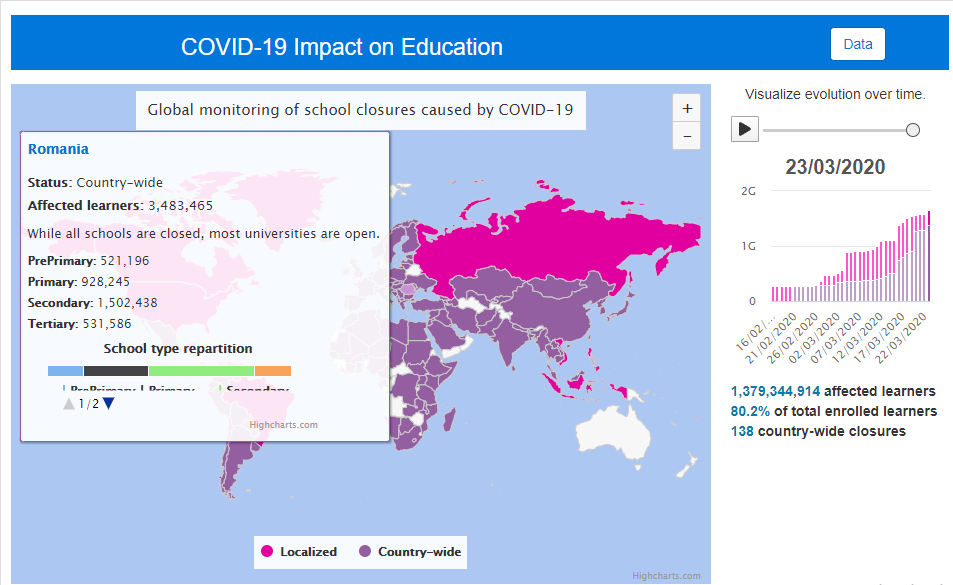 Astfel, putem urmări Institutului UNESCO pentru statistici, care actualizează platforma cu date despre situația învățământului la nivel global. Cifrele apărute pe platformă corespund cu numărul de studenți și elevi înscriși la nivelurile de învățământ preșcolar, primar și secundar.