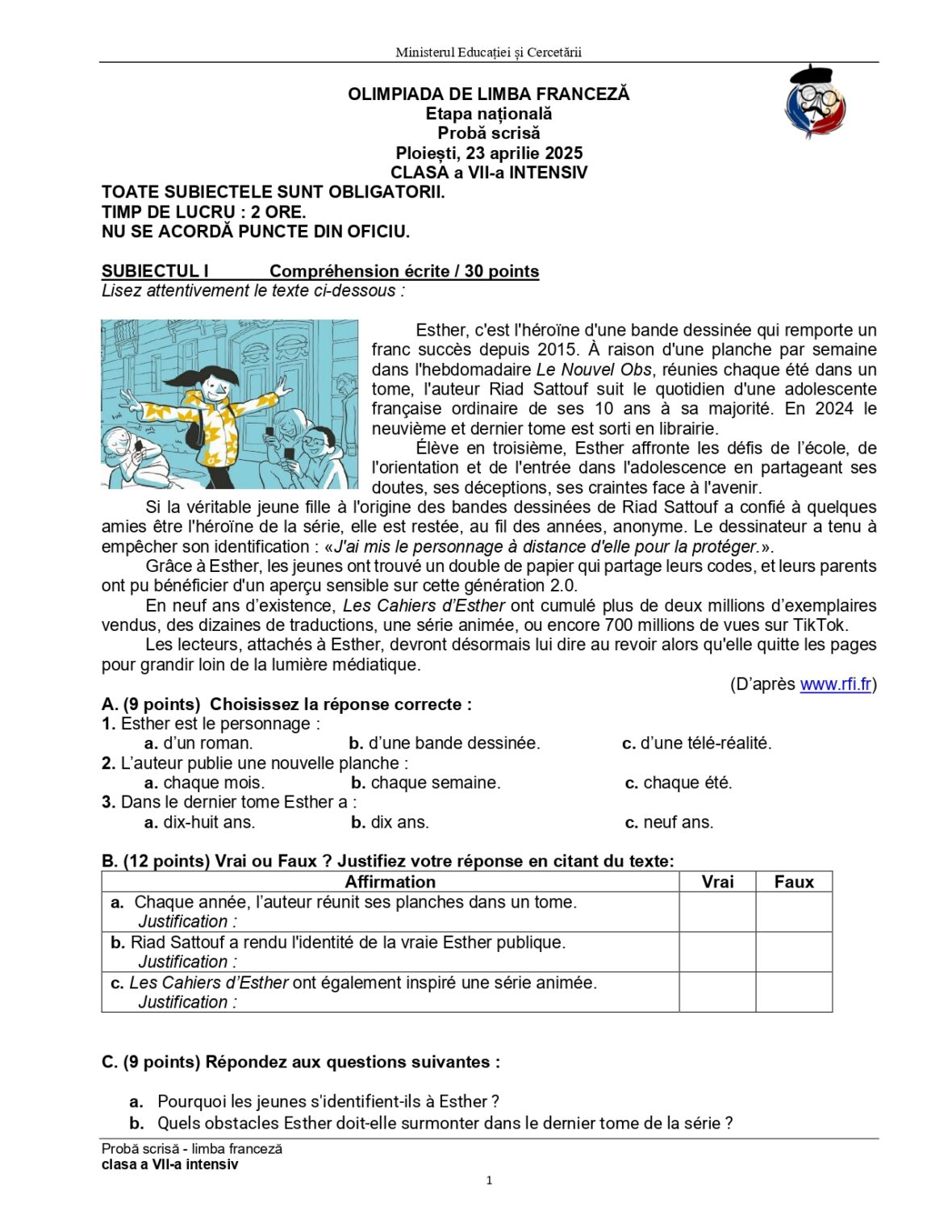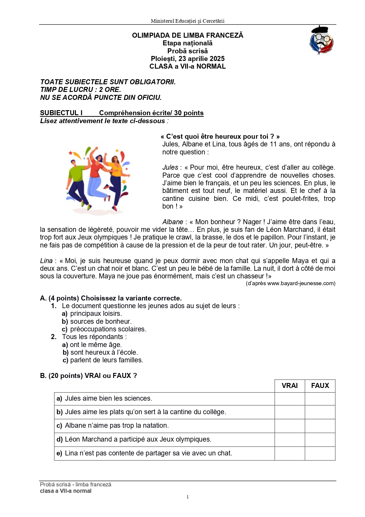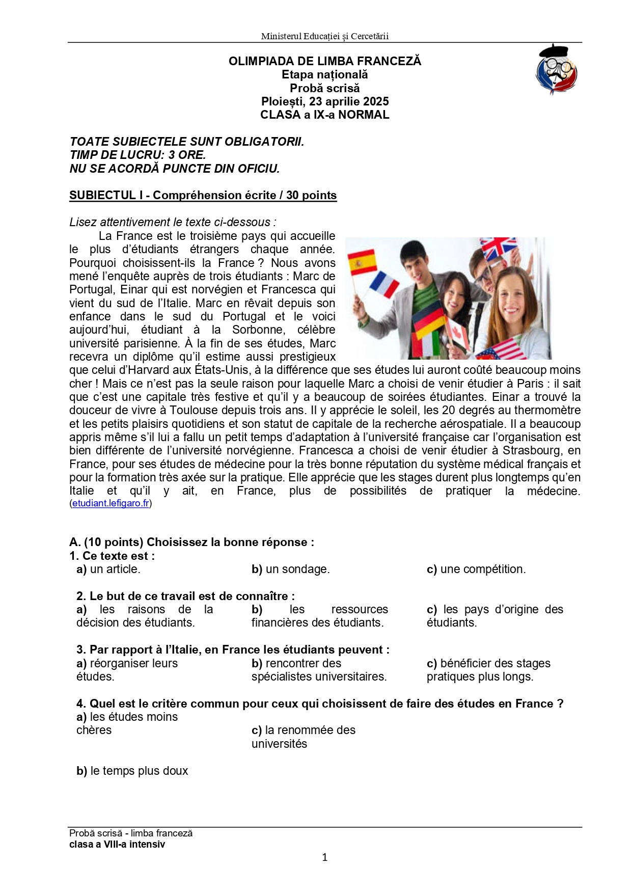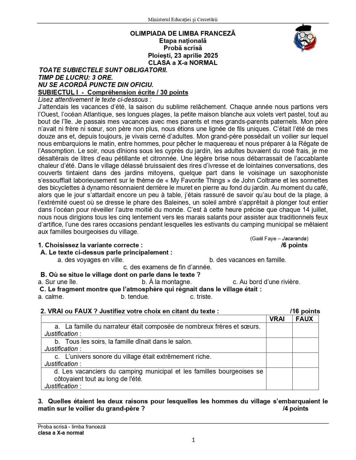Olimpiada de Limba franceză 2025, etapa națională Ploiești. Subiectele și baremele de corectare