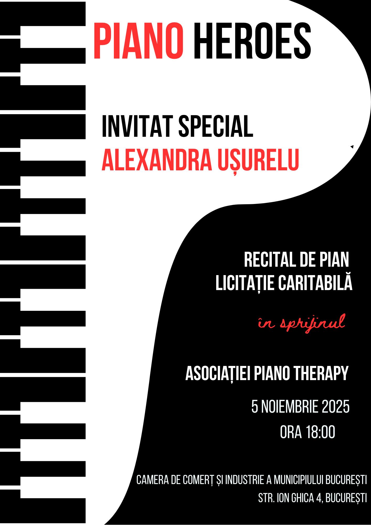 Asociația Piano Therapy marchează 10 ani de activitate prin evenimentul caritabil „Piano Heroes”, care va avea loc pe 5 noiembrie 2025, la Camera de Comerț și Industrie a Municipiului București. Evenimentul include un recital de pian susținut de Alexandra Ușurelu și o licitație caritabilă în sprijinul copiilor diagnosticați cu autism.