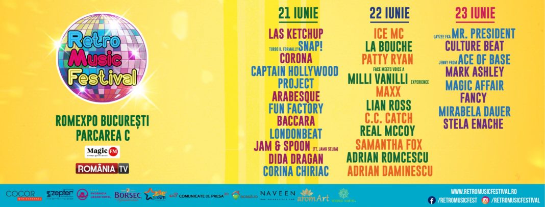 Retro Music Festival se va desfășura în perioada 21-23 iunie la Romexpo (parcarea C), București. În cele trei zile de festival, artiștii care vor urca pe scenă pe ritmurile muzicii disco și pop sunt:
