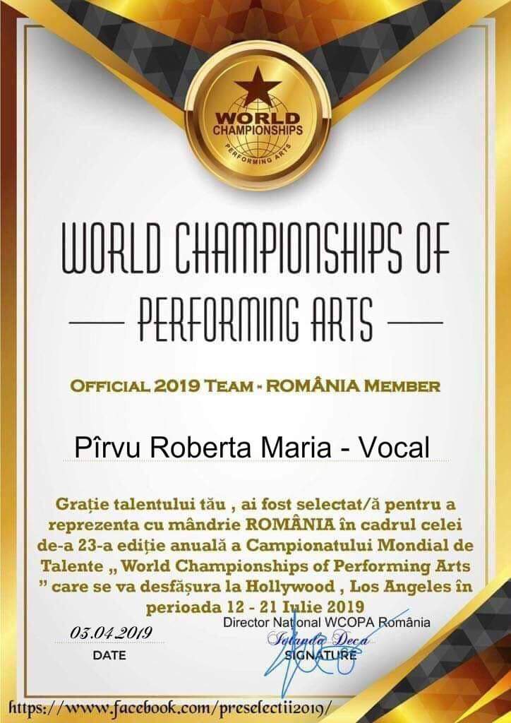 World Championships of Performing Arts este cel mai mare și mai renumit concurs de talente din lume care are loc la Hollywood. Anual, 1500-2000 de participanți din peste 60 țări, au parte de un bootcamp maraton de 12 ore unde celebrități din USA precum Richard Gere, Eddie Murphy, Romeo Johnson , etc vin să le împărtășească din experiențele lor și să îi învețe diverse strategii și metode despre modul în care pot să ajungă să aibă o carieră de succes.