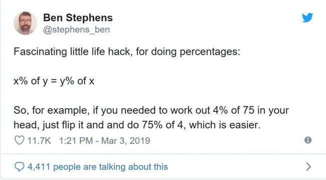 Datorită unui truc briliant al copywriter-ului Ben Stephens, totuși, toate acestea se vor schimba. Ben și-a împărtășit „micul truc fascinant” pentru elaborarea procentelor pe Twitter, unde a fost rapid observat de mulți utilizatori recunoscători și a stârnit numeroase reacții.